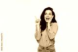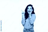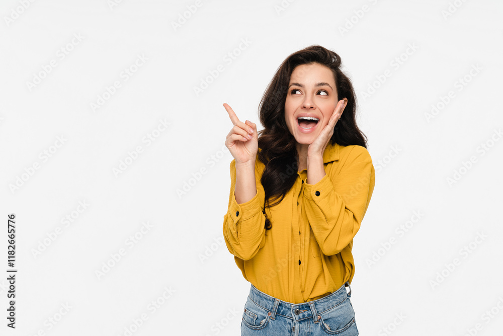 Photo of young funky excited positive woman girl sales manager wear casual clothes finger pointing up empty space for advertisement isolated on white color background