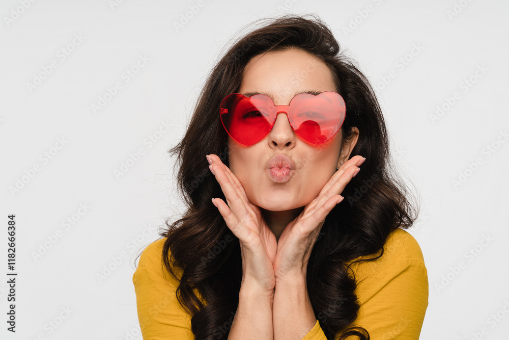 Photo of young woman lady girl in bright stylish trendy red heart shape sunglasses eyeglasses spectaculars touching her face cheeks send blowing kiss posing standing isolated over white background