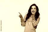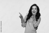 Photo of young funky excited woman maid cleaning girl housekeeper wife in latex gloves apron finger pointing up empty space for advertisement isolated on white color background