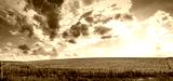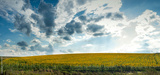 A golden expanse of sunflowers stretches across the horizon under a sky filled with dynamic textured clouds.