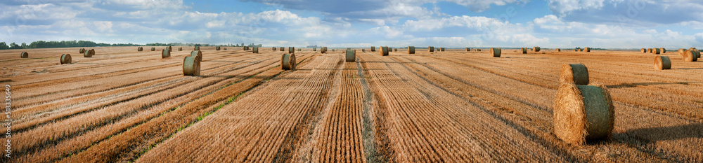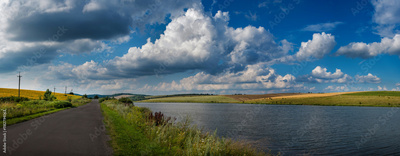 countryside near lake with asphalt road, pond, countryside hills, arable fields, under bright blue sky, travel