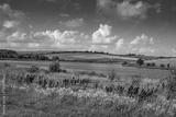 various wild grasses on the shore of a reservoir, blue sky with clouds