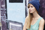 Beautiful woman in vest and woolly hat