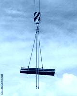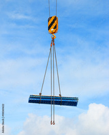 Yellow crane hook lifting load over clouds on blue sky. Construction industry background.