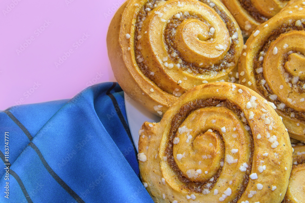 Cinnamon rolls on purple background with textured blue fabric close-up