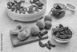 Home made dried apricots and fresh fruits on a kitchen table, fruit drier in the background