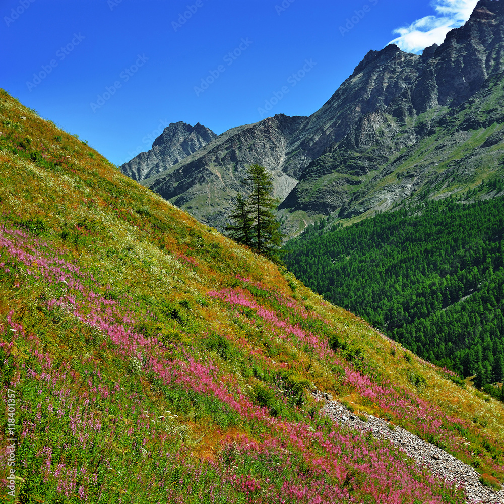 slopes on valley in Gran Paradiso National Park with violet flowers