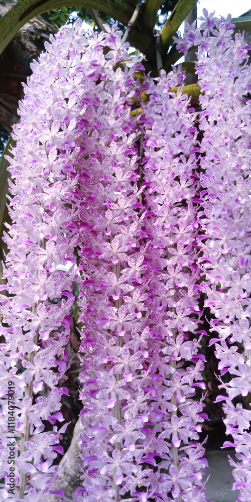 an orchid with purple and white patterns in bloom taken from the top of the tree (KOPOU PHUL)
