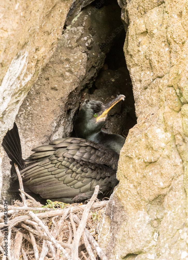 Cormorant guarding on nest at the isle of Lunga, Inner Hebrides, Scotland, UK