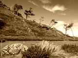 Windswept tree line at Calgary beach, Calgary, Isle of Mull, Scotland, UK