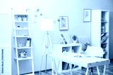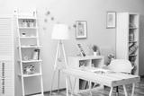 Wooden table in blue children room interior