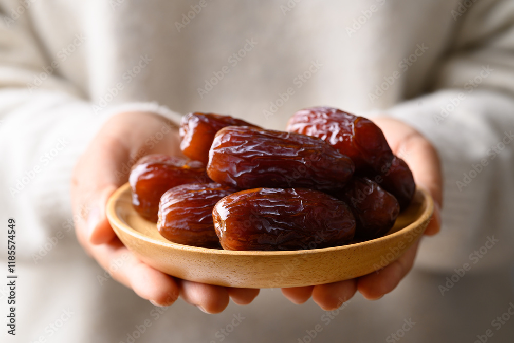 Date palm fruit (MedJool) on wooden plate holding by hand