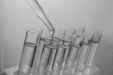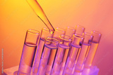 Close up of a pipette dropping a sample into a test tube on colourful background