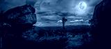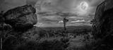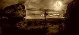 Panorama of tree and boulders against nighttime sky with cloudy.