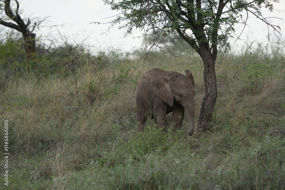 young african elephant playing and discovering its trunk in the serengeti national park in tanzania