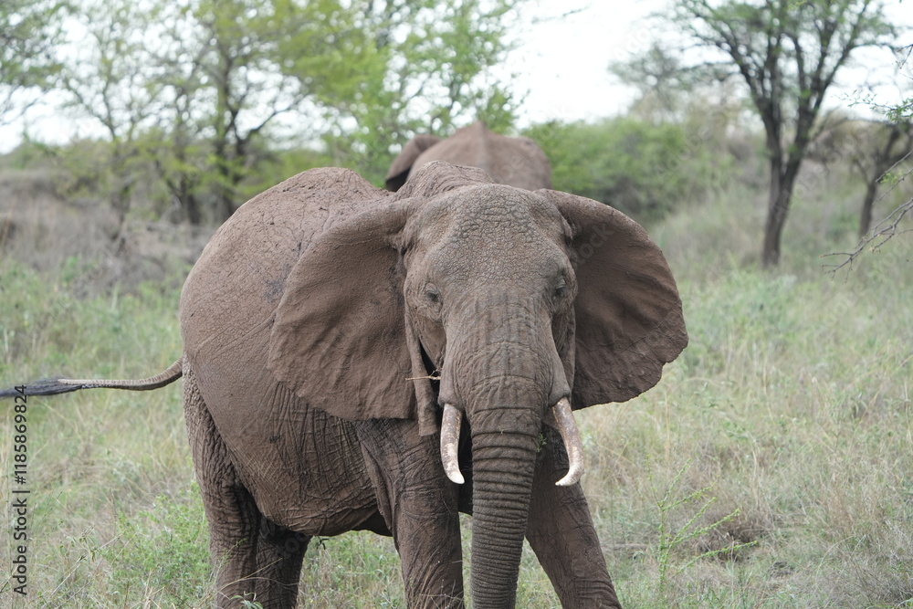 close up of an elephant in the serengeti Tanzania facing the camera, portrait, young adult elephant