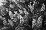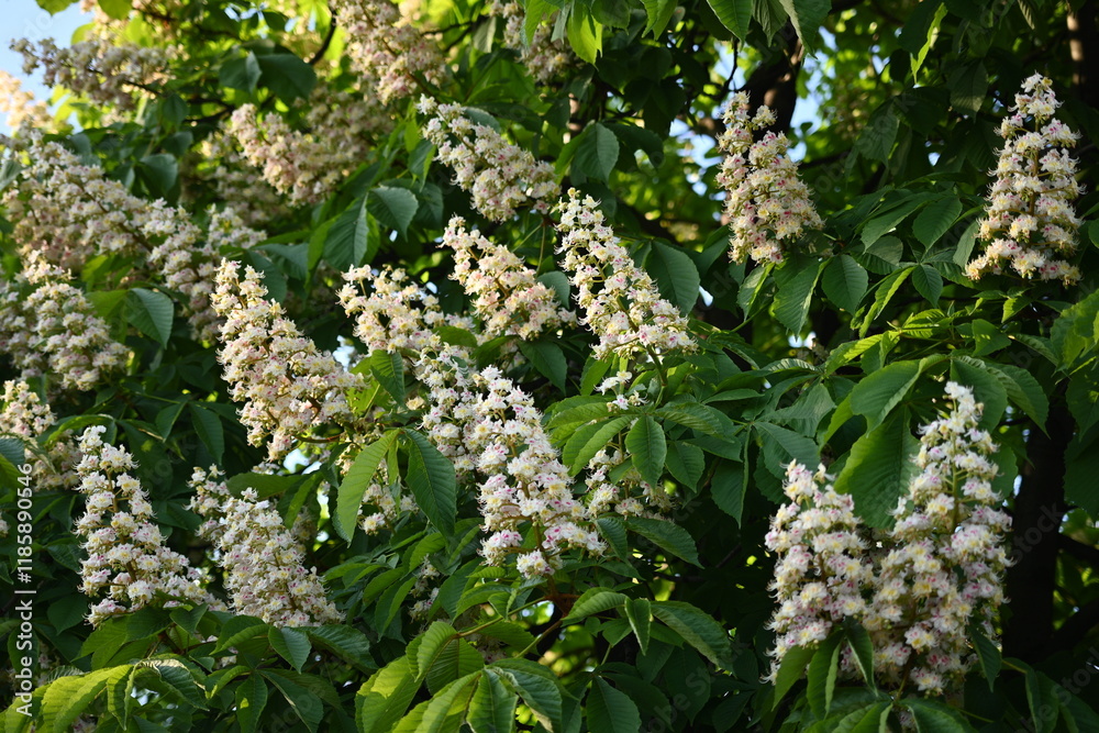 Blooming horse chestnut tree with white flowers and green leaves – spring blossom close up, natural floral background, seasonal nature detail of chestnut flowering branches in daylight