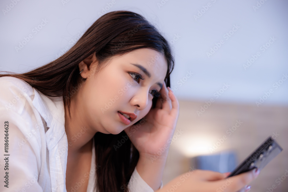 woman feel uncomfortable and stressed when she saw a message on her phone while lying on a bed in bedroom inside an apartment.
