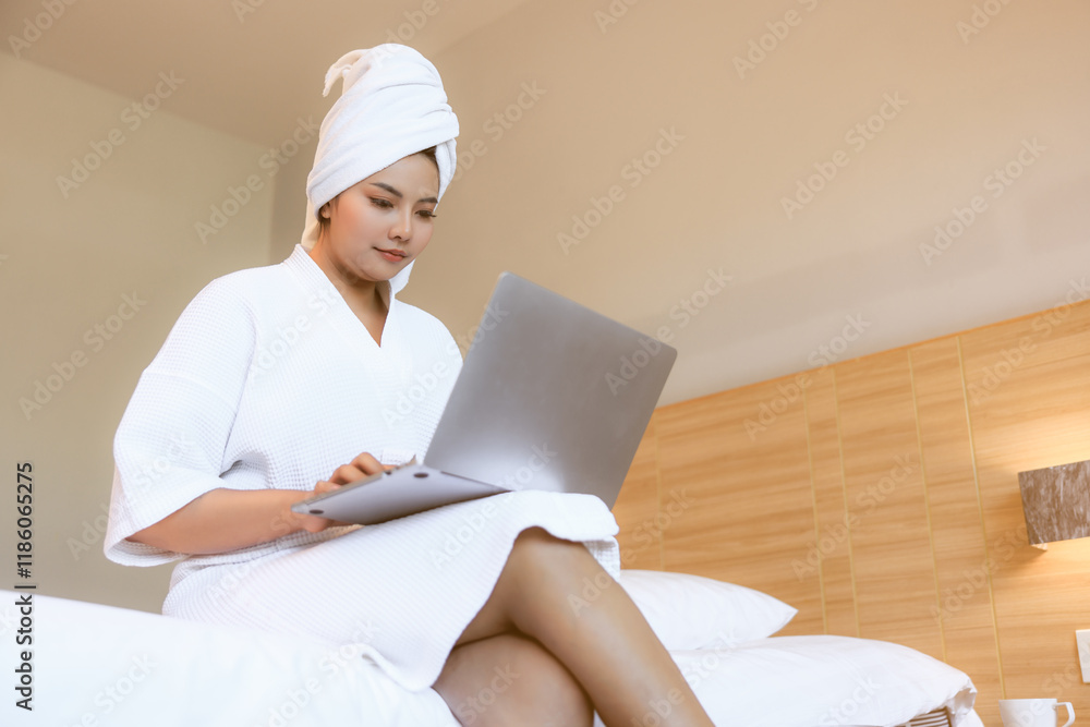young woman chatting on a video call to her friend using laptop while sitting on double bed in bedroom.