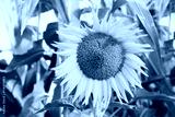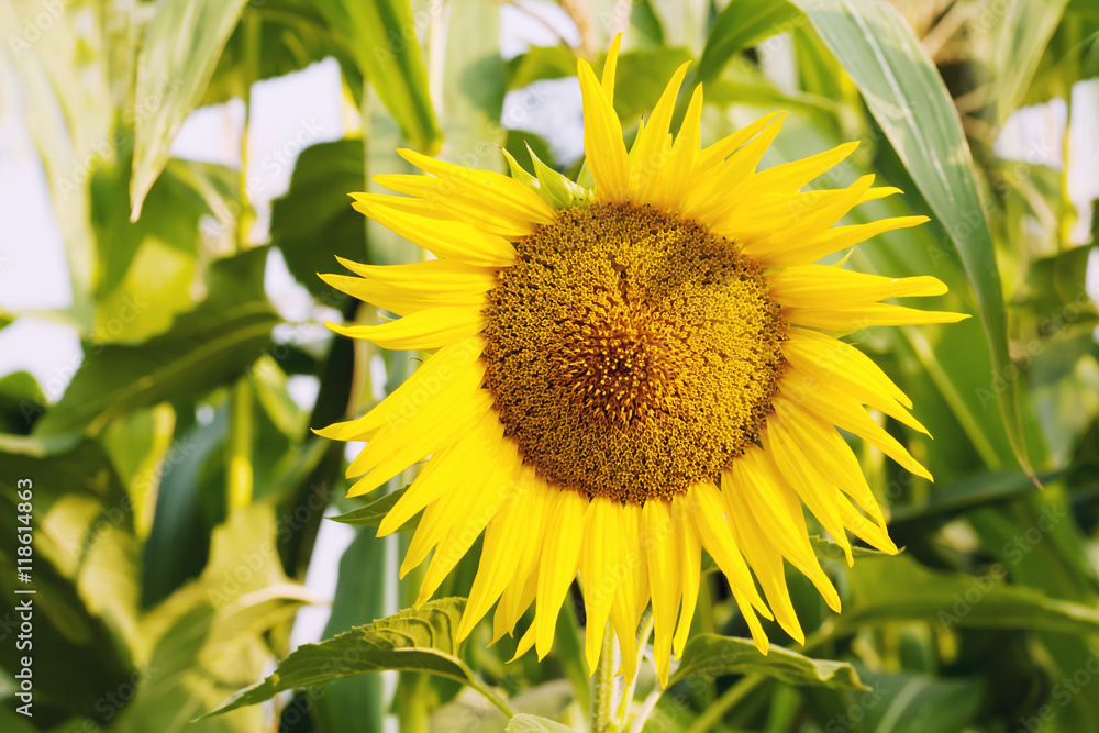 Blooming sunflower. Summer day sunset time landscape