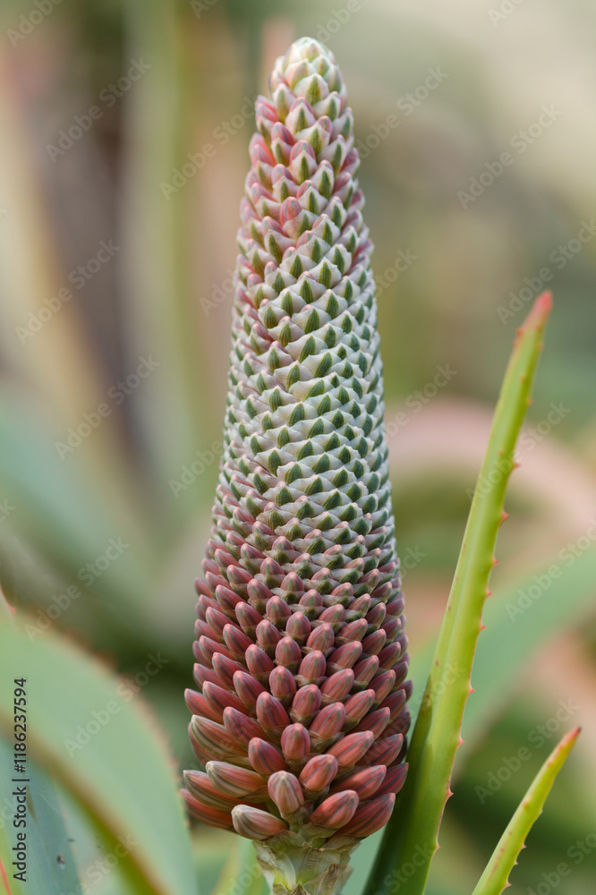 Aloe speciosa aka tilt-head aloe succulent regular unopened bud pattern, natural macro floral background