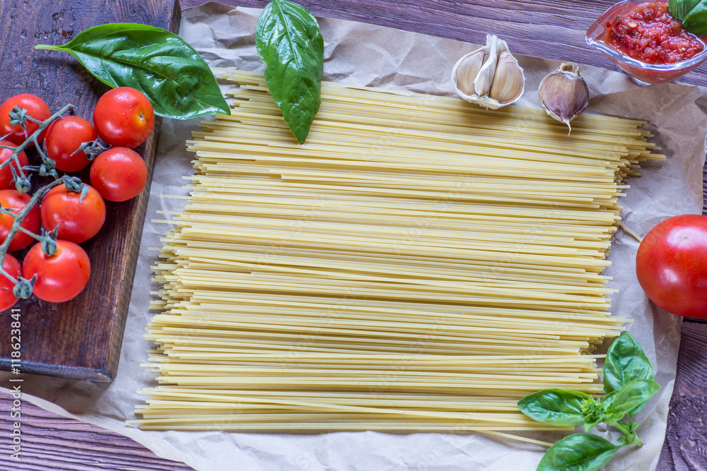 Pasta ingredients. tomato, garlic, pepper, and oil on wooden bac