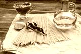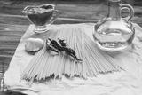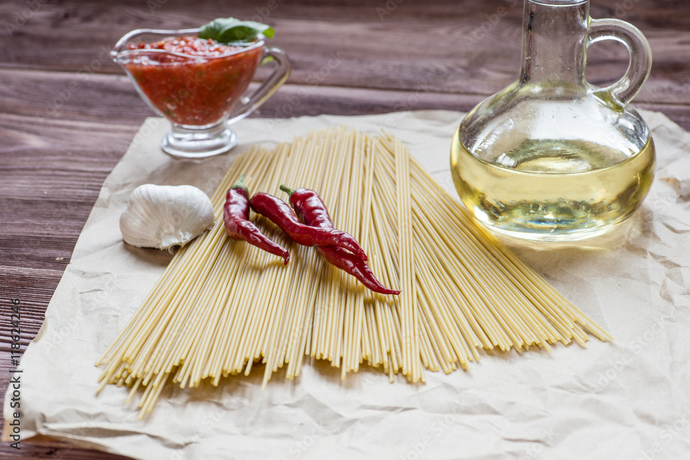 Pasta ingredients. tomato, garlic, pepper, and oil on wooden bac