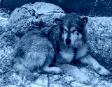 A serene image capturing a snow-dusted husky sleeping curled up on the ground, surrounded by hay and circular sleds, conveying a sense of calm and warmth amidst winter's chill.