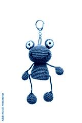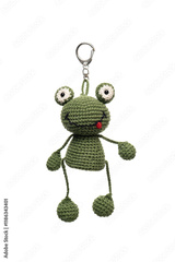 A cute, handmade crochet frog keychain with large eyes, a smiling face, and a small red tongue, attached to a metal keyring, isolated on a white back