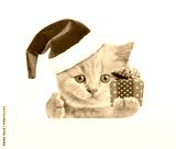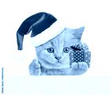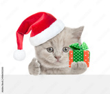Cute cat holding tiny gift box above blank white banner and showing thumbs up gesture. isolated on white background