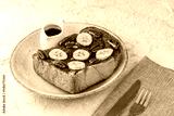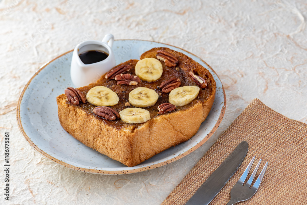 A single thick slice of cinnamon toast with sliced bananas and chopped pecans on top. The toast is on a white plate with a small white pitcher of syrup on the side. There is a brown napkin and a knife