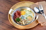 A photo of a plate of food that has two eggs, bacon, and other ingredients.