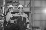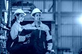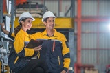 Factory apprenticeship. Man mentor teaching Female employees trainee operating machine looking monitors and check Production process machinery. foreman explaining woman engineer control machine .