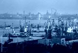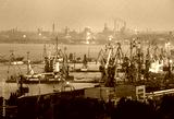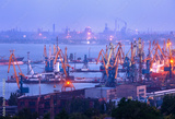 Sea commercial port at night against working steel plant in Mariupol, Ukraine. Industrial landscape. Cargo freight ship with working cranes bridge in sea port at dusk. Cargo port, logistic