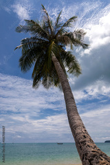Beautiful palm tree on the beach. Blue sky with clouds in the background. Tropical paradise island.