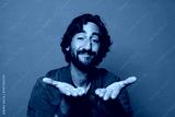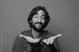 smiling happily with friendly, confident, positive look, offering and showing an object or concept