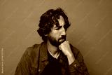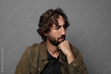 feeling serious, thoughtful and concerned, staring sideways with hand pressed against chin