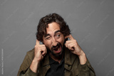 looking angry, stressed and annoyed, covering both ears to a deafening noise, sound or loud music