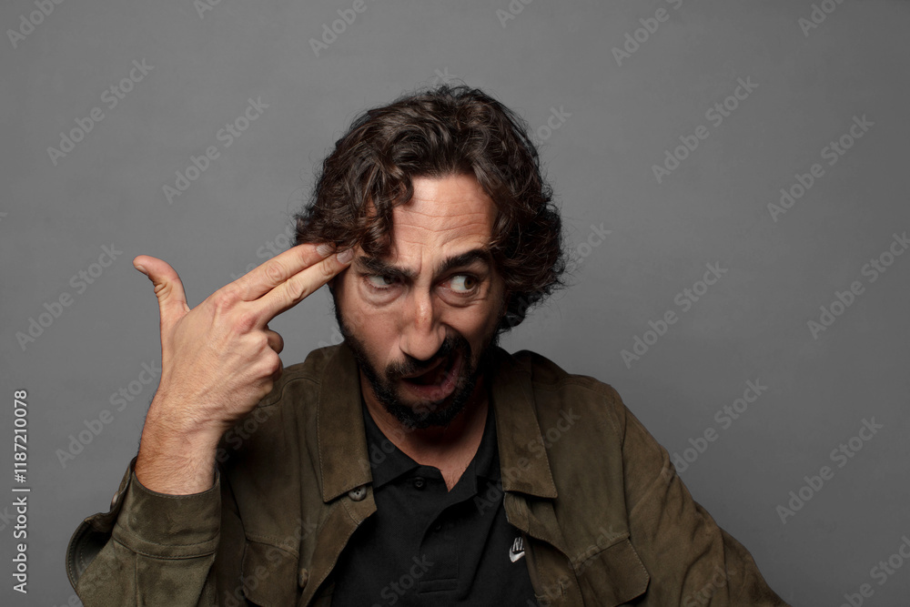 looking unhappy and stressed, suicide gesture making gun sign with hand, pointing to head