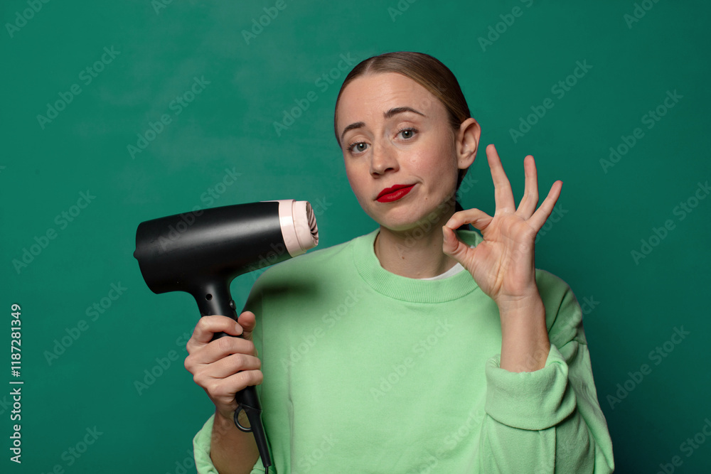 young blonde woman with a hair dryer