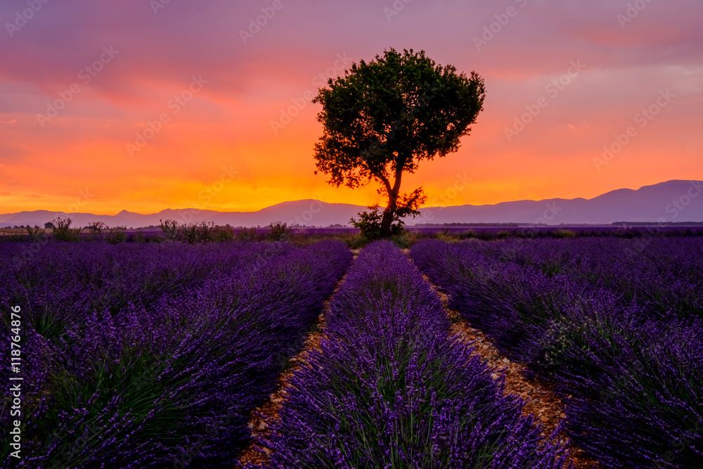 Tree in lavender field at sunrise in Provence, France