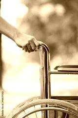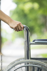 Empty wheelchair pushed by nurse's hands