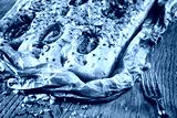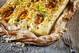 Freshly baked traditional Italian focaccia with tomatoes and herbs in baking paper on an old wooden table.