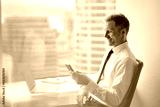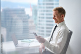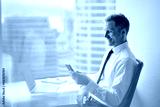 Busy happy professional business man leader, young male executive, smiling businessman banking manager using financial apps on smartphone holding mobile cell phone working at office. Candid photo.