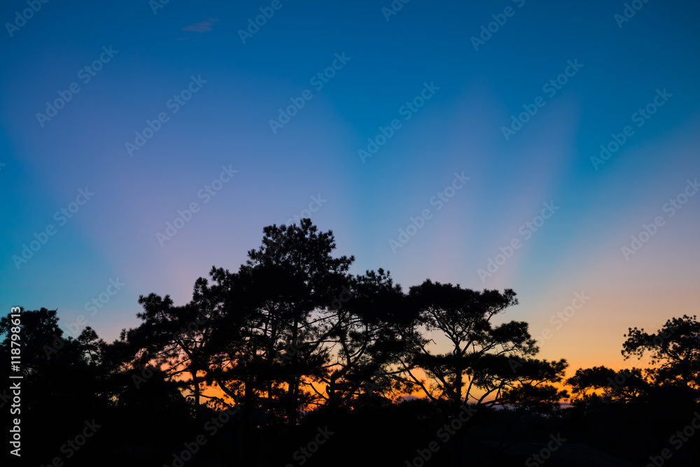 Silhouette pine forest in sunset evening on the mountain, nature traveling or save the earth concept.