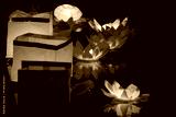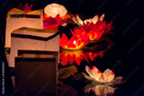 Floating paper lanterns on the water at night