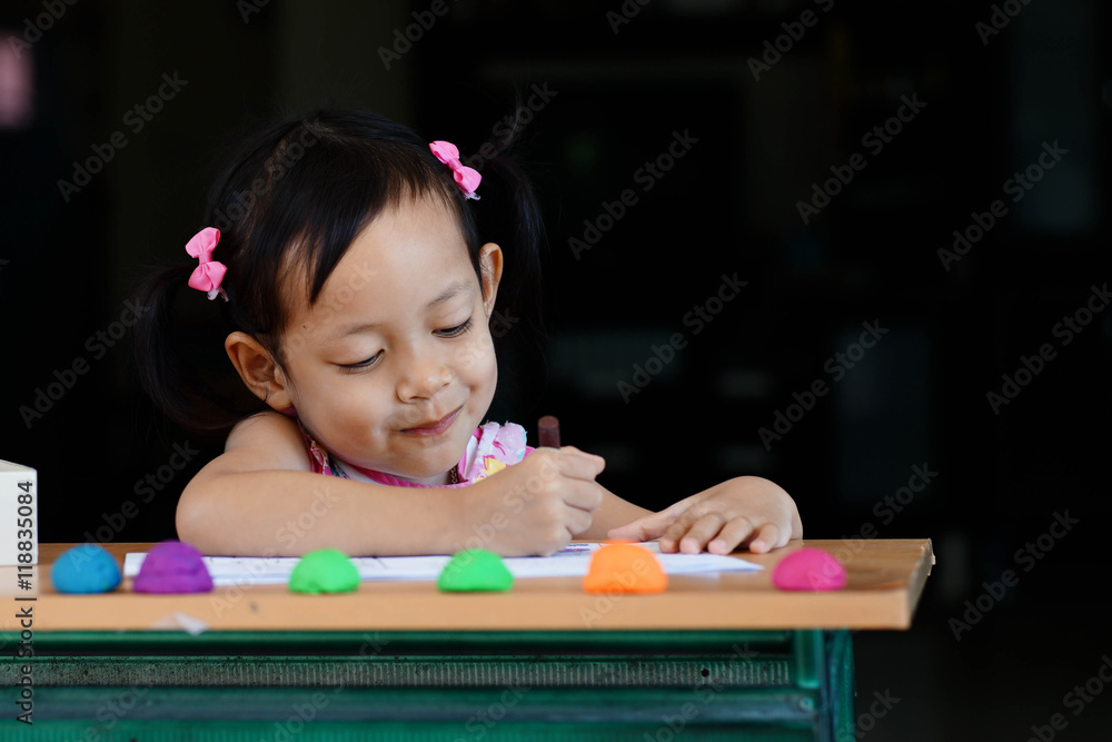 Cute little girl is drawing on table at home.l