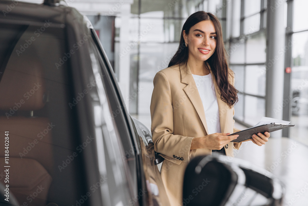 Handsome car dealership female worker in suit is holding a folder and smiling while standing near the car