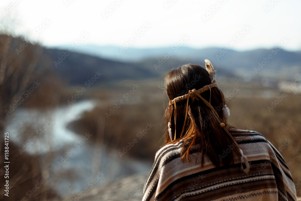 beautiful boho woman shaman sitting on rocks