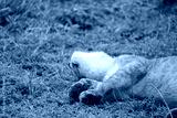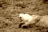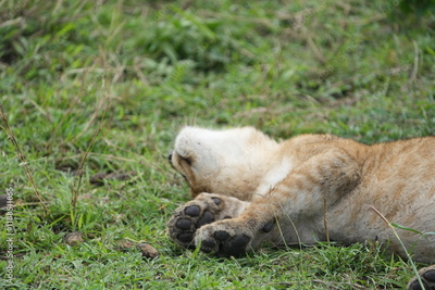 lion sleeping in the serengeti national park totally out, seeing under chin and his little paws up in the air